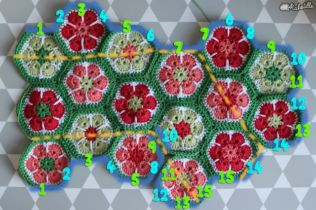 Sachant que ce n'est pas toujours facile de gérer la couture dans les coins, j'ai préféré ne pas toucher du tout à ceux de mes hexagones (sur la maille en l'air) : cela forme donc des trous mais ça me convient très bien !