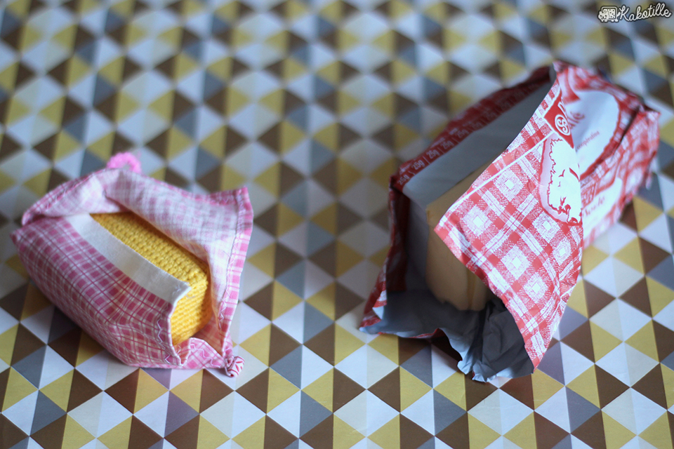 Bon, ma Maman et mon frère m'ont fait remarquer que les plaquettes de beurre sont souvent moulées, avec des stries sur la hauteur et des angles arrondis. Ouais mais je trouvais ça compliqué à reproduire au crochet. Très certainement faisable, mais ça compliquait le modèle et je n'avais ni l'envie ni le temps.