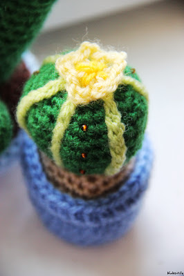 Ensuite, le petit orange et le petit bleu sont arrivés ensemble. Ils ont été très longtemps nus (comme on peut le voir sur certaines photos de groupe), avant que je me décide enfin à leur coudre des perles, et une fleur pour la boule. Ils viennent tous deux de ce modèle, cactus 1 et 2.